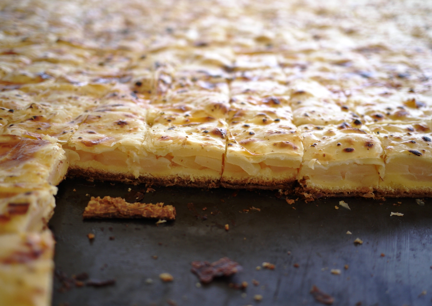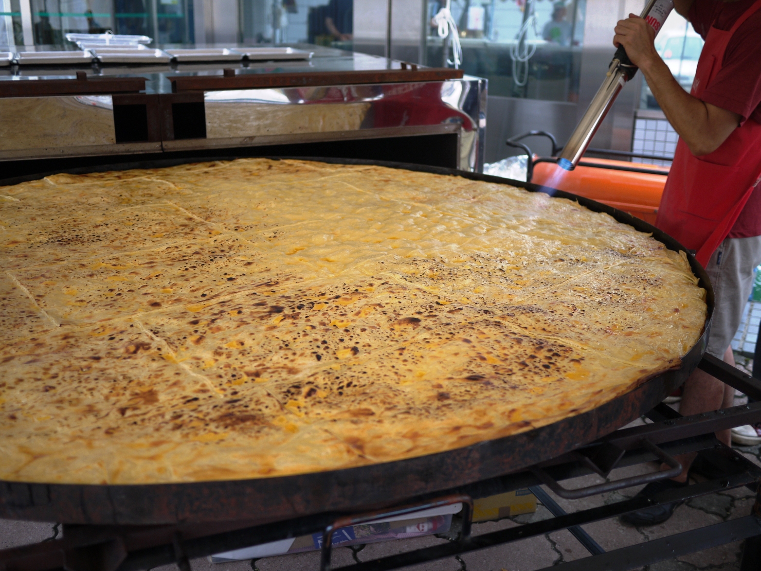 この直径2mのアップルパイ、まずその大きさに圧倒されます。約800食取れるのですがただ大きいだけではなく、使用するリンゴは『栄黄雅』と言って皮が薄い黄色で酸味が強いお菓子作りに適したリンゴなのですが、まだ市場には出回っていない品種だそうです。その貴重なリンゴを400個惜しげもなく使用してできたアップルパイは生地は程良くしっとりとし、リンゴのフィリングとのバランスが絶妙で甘さも丁度良く本当に美味しいです。(因みに焼き立ても美味しいのですが、少し時間を置いたものの方がバターがよくなじんでより美味しく食べられるそうです。)