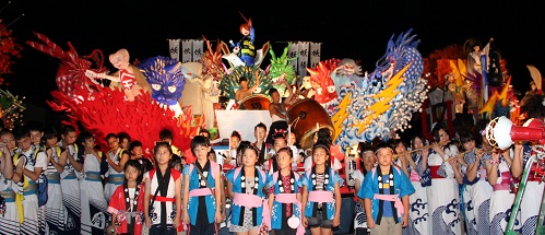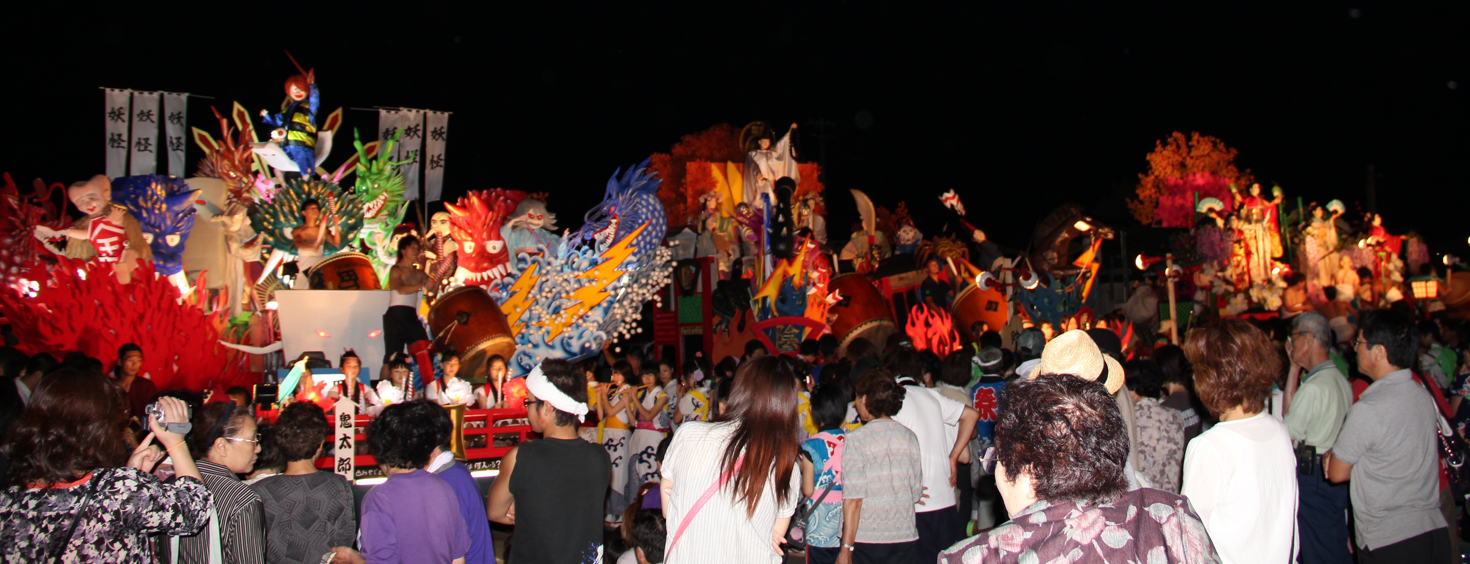 この日は夕方から前夜祭、役場前駐車場に全町内会の山車が勢ぞろい。
