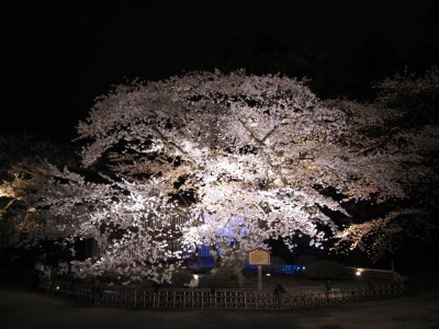 こちらは日本最古のソメイヨシノです。二の丸与力番所と東内門の間にあります。推定樹齢127年だそうです。1882年(明治15年)旧藩士『菊池楯衛』により植えられたソメイヨシノ1000本のうちの1本らしいです。撮影が早朝なのでやはり暗いですが、夜桜は特殊なライトを使用してとても綺麗です。それがこちら!