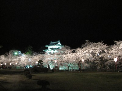 こちらは日本最古のソメイヨシノです。二の丸与力番所と東内門の間にあります。推定樹齢127年だそうです。1882年(明治15年)旧藩士『菊池楯衛』により植えられたソメイヨシノ1000本のうちの1本らしいです。撮影が早朝なのでやはり暗いですが、夜桜は特殊なライトを使用してとても綺麗です。それがこちら!