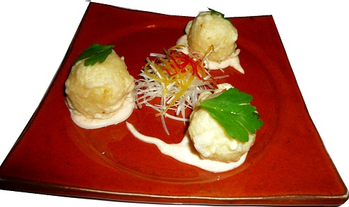 たまらなく ふんわりしたポテトの中のとろけるカマンベールそして命わき役のソース!全く理想的な組み合わせのタラコとマヨネーズの「タラモソース」間違い無しに、最高に美味しい一品です。