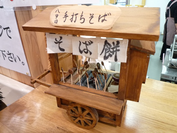 七戸町の道の駅内にある 食堂 八甲田さんの店先のカウンターにちょこんと乗るこの屋台 八甲田の手打ちそばを宣伝しながら、そば餅も もれなく アピールする作戦!