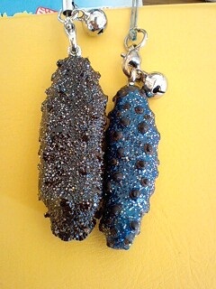 なまこストラップの原料は、陸奥湾で体長約8センチにまで育った2年物のマナマコ。 乾燥させて半分ほどの大きさになったナマコを、ラメ入りの塗料でコーティング。