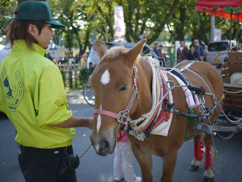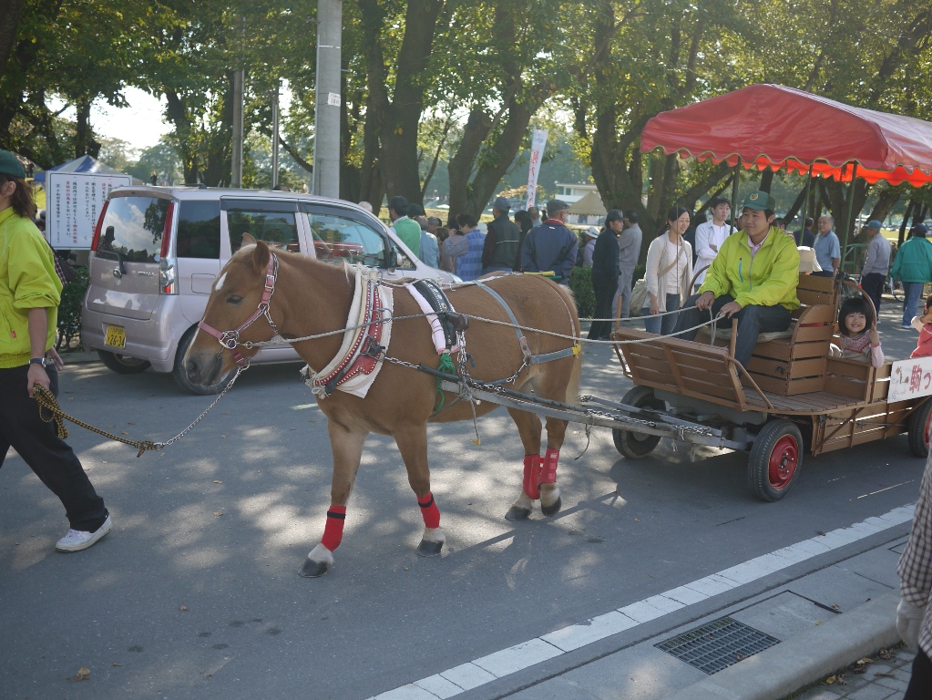 緑地公園の外では駒っこランドの人達が馬車運行をしていました。馬車運行の受付には北里大学の学生さんが手伝ってくれていました。