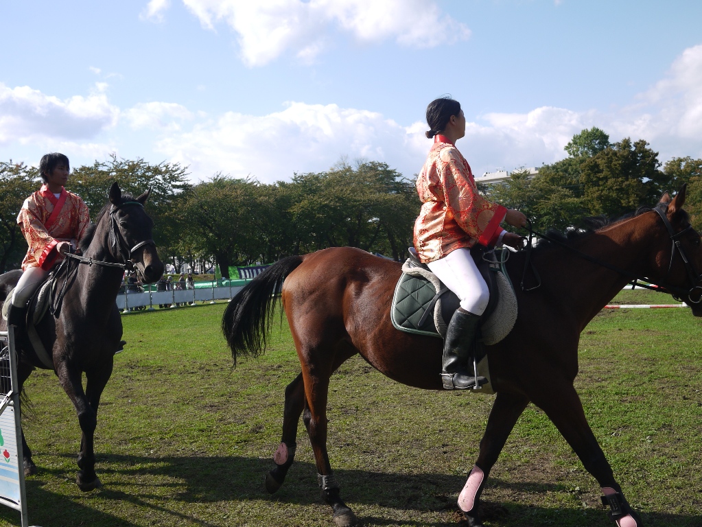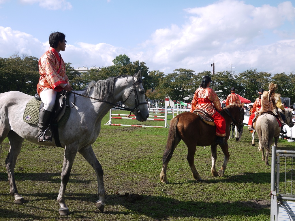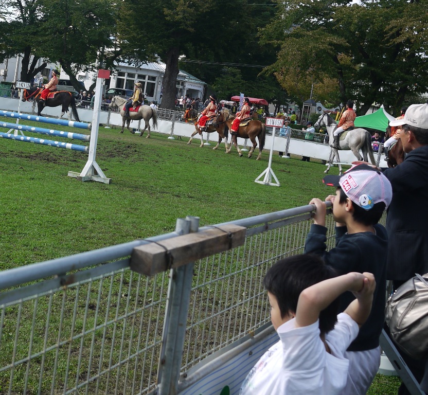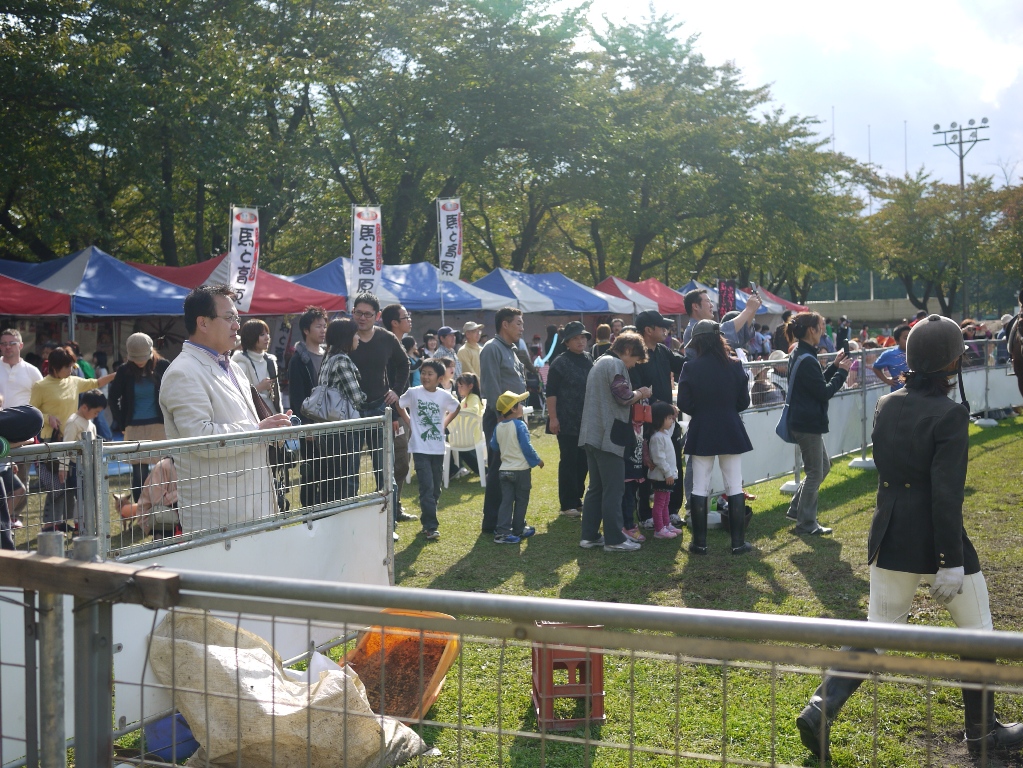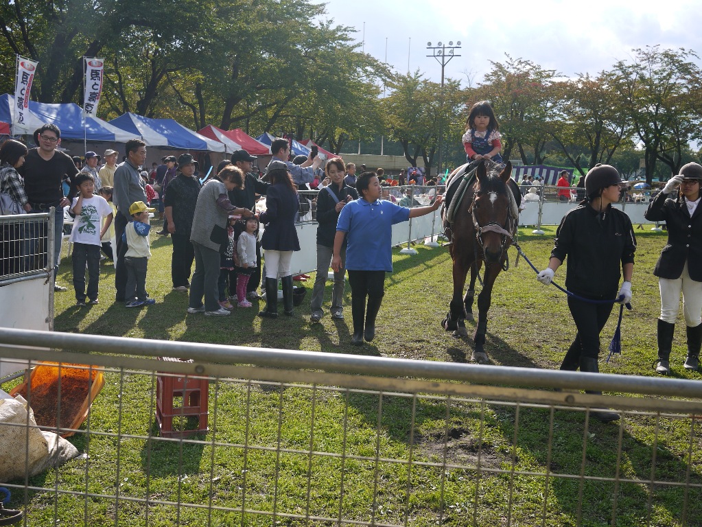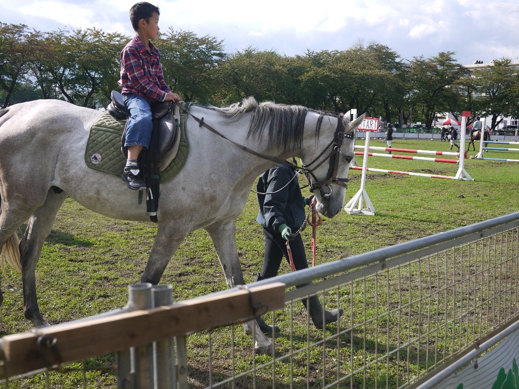 行進が終わるとジャンプ競技に出ていてさっきまで行進していたサラブレッド達での乗馬体験コーナーがおこなわれました。やはりここでも行列ができていて、後ろの人達もまだかまだかと自分の番がくるのを待っていました。